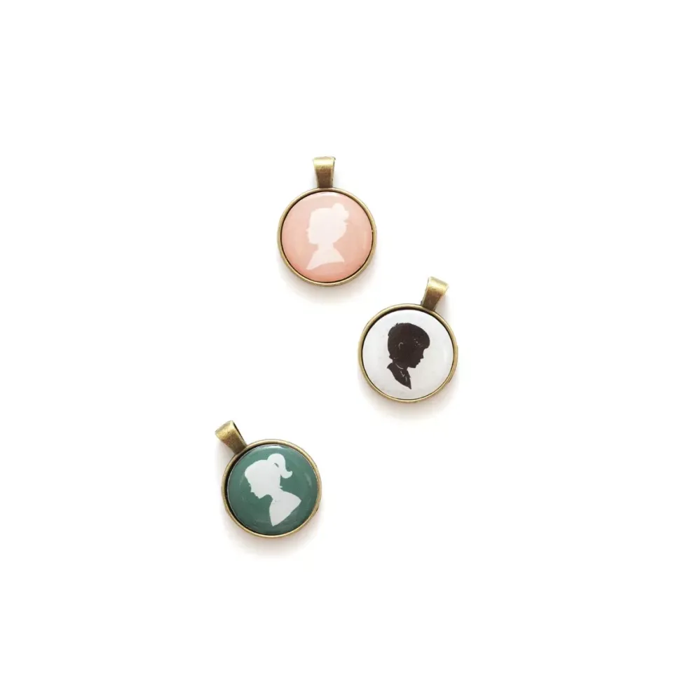 - Los colgantes son en forma de círuclo metálico en oro con epoxy de diferentes diseños en su interior.