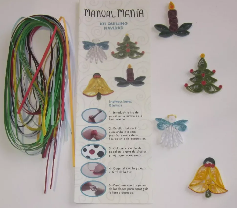 - Conjunto de elementos de Quilling para realizar figuras de un ángel, una campana, una vela, y un árbol de Navidad.