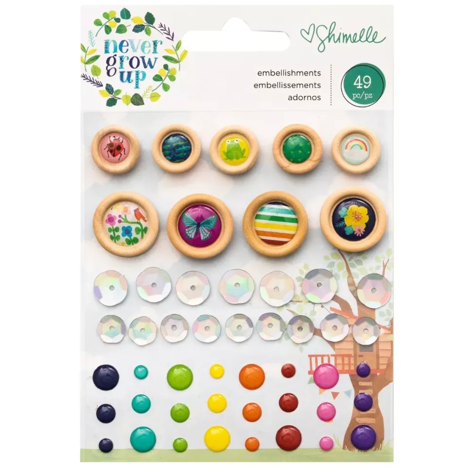 - – 9 Botones de madera con ilustraciones de la colección Never Grow Up.