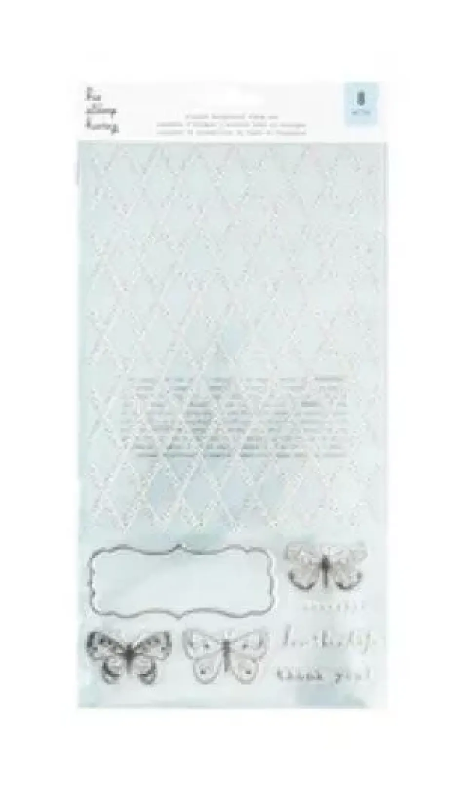 - Contiene 8 sellos, un sello grande para hacer un fondo de rombos, y 7 sellos más pequeños con mariposas y frases en inglés como «Thank you» o «Grateful».