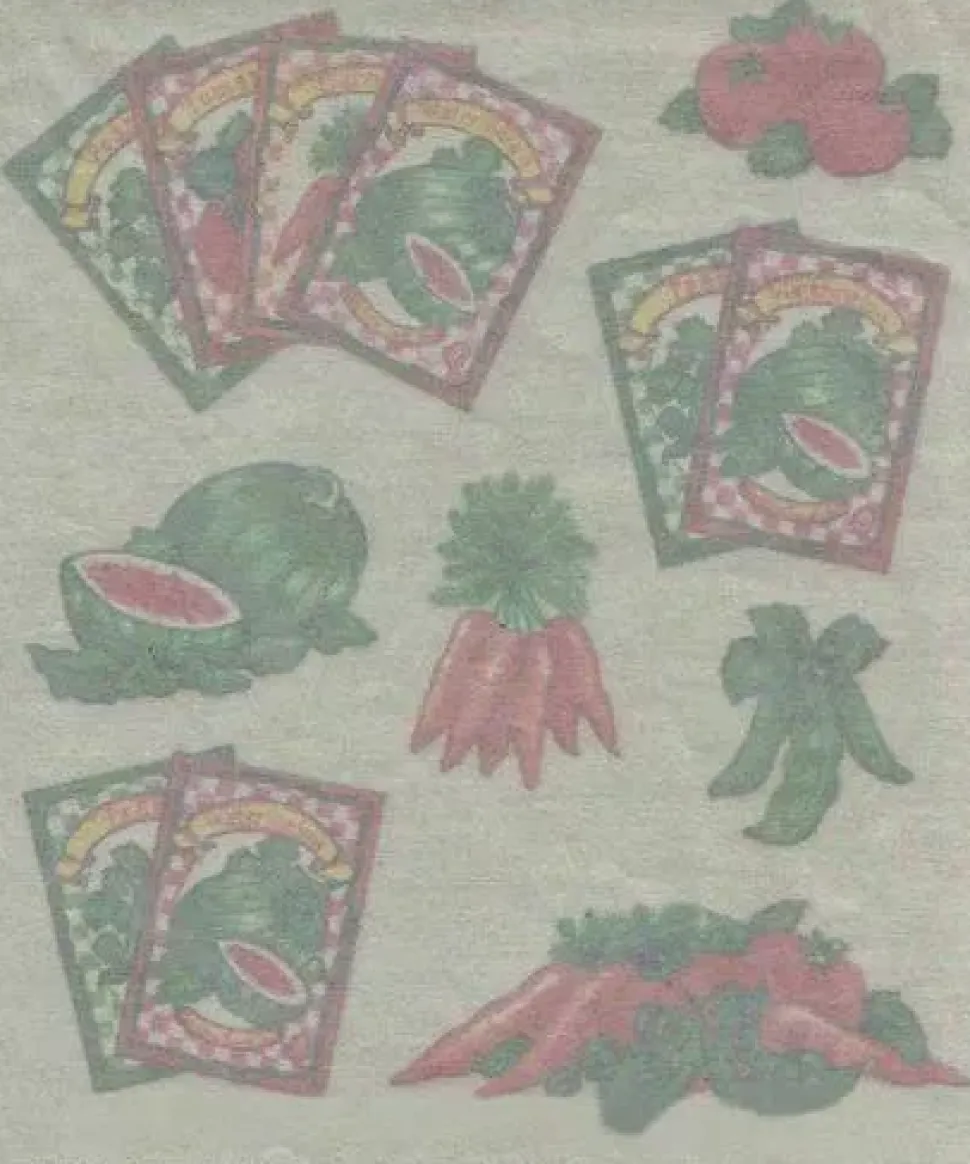 – Paquetes de semillas y hortalizas – Seed packets & vegetables.- Medidas 15×20 cm.Transferibles apropiados para madera, cerámica, papel, cristal, espejos, plástico etc. Contiene aplicador, de fácil uso y rápida aplicación.A quick and easy hand painted look on most surfaces: great for wood, paper, plastic, metal, ceramics ect.
