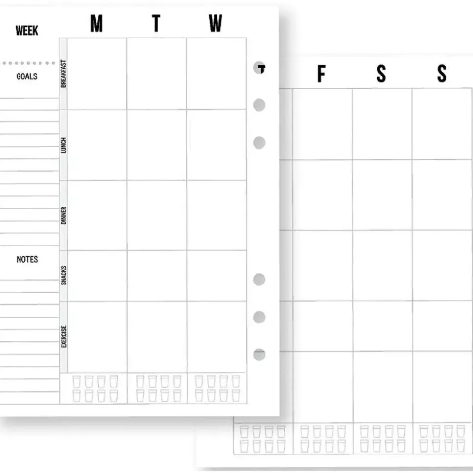 - – 5 páginas dobles a semana vista con espacio para comida, ejercicios, vasos de aguas