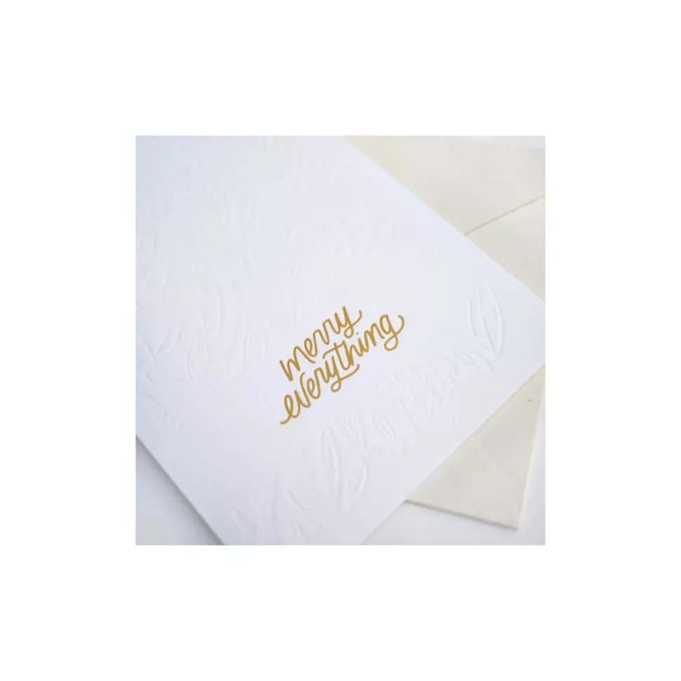- El diseño contiene un embosado de motivos vegetales en un fondo blanco con la frase Merry Everything.