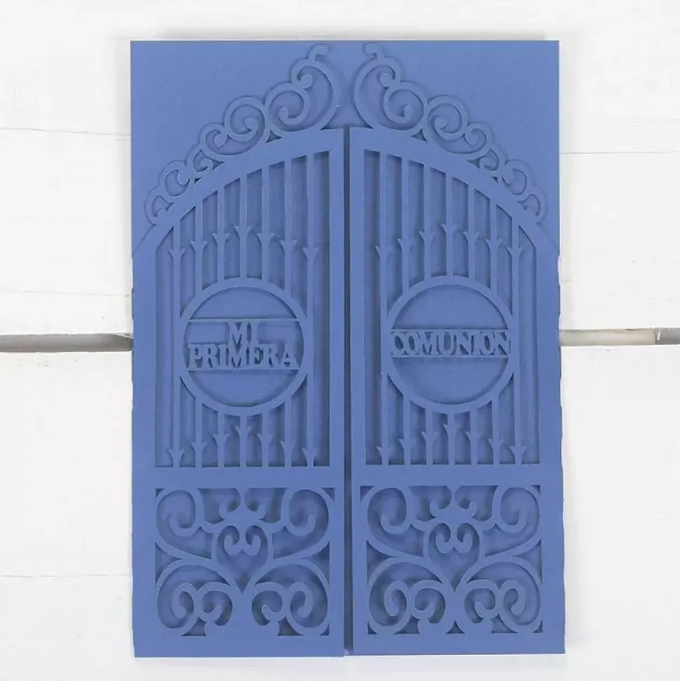 - Tarjeta de tamaño 19×13,5 cm. de color azul con apertura por los laterales en forma de verja.