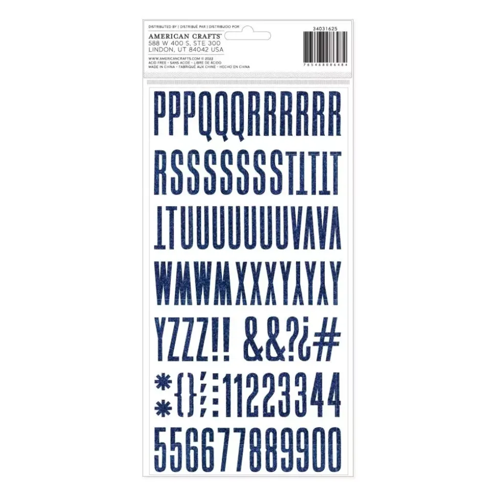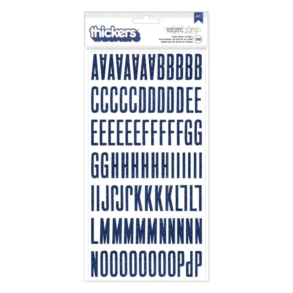 - Letras adhesivas en foam con acabado glitter en color azul marino.