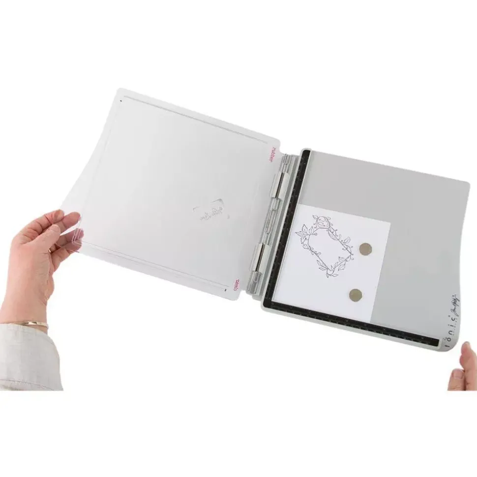 La superficie de estampado es abierta por dos de los laterales, por lo que puedes introducir también tus hojas de 30×30 cm.