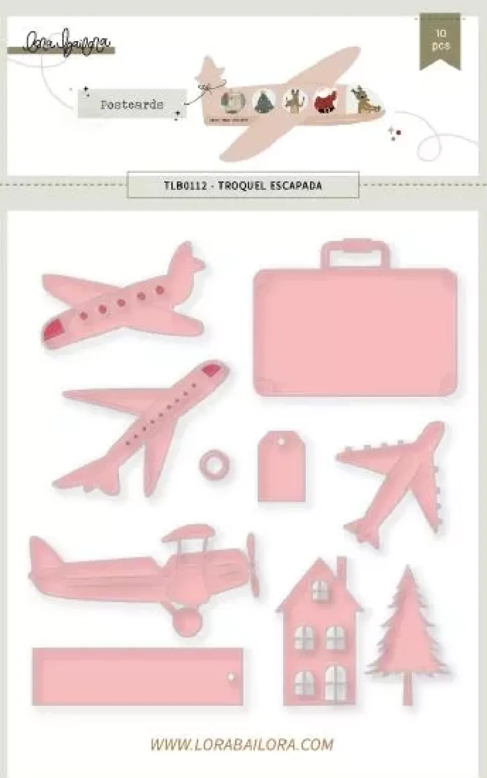 - Troquel para realizar diferentes diseños de aviones, una maleta, una casa, un abeto y dos tags.