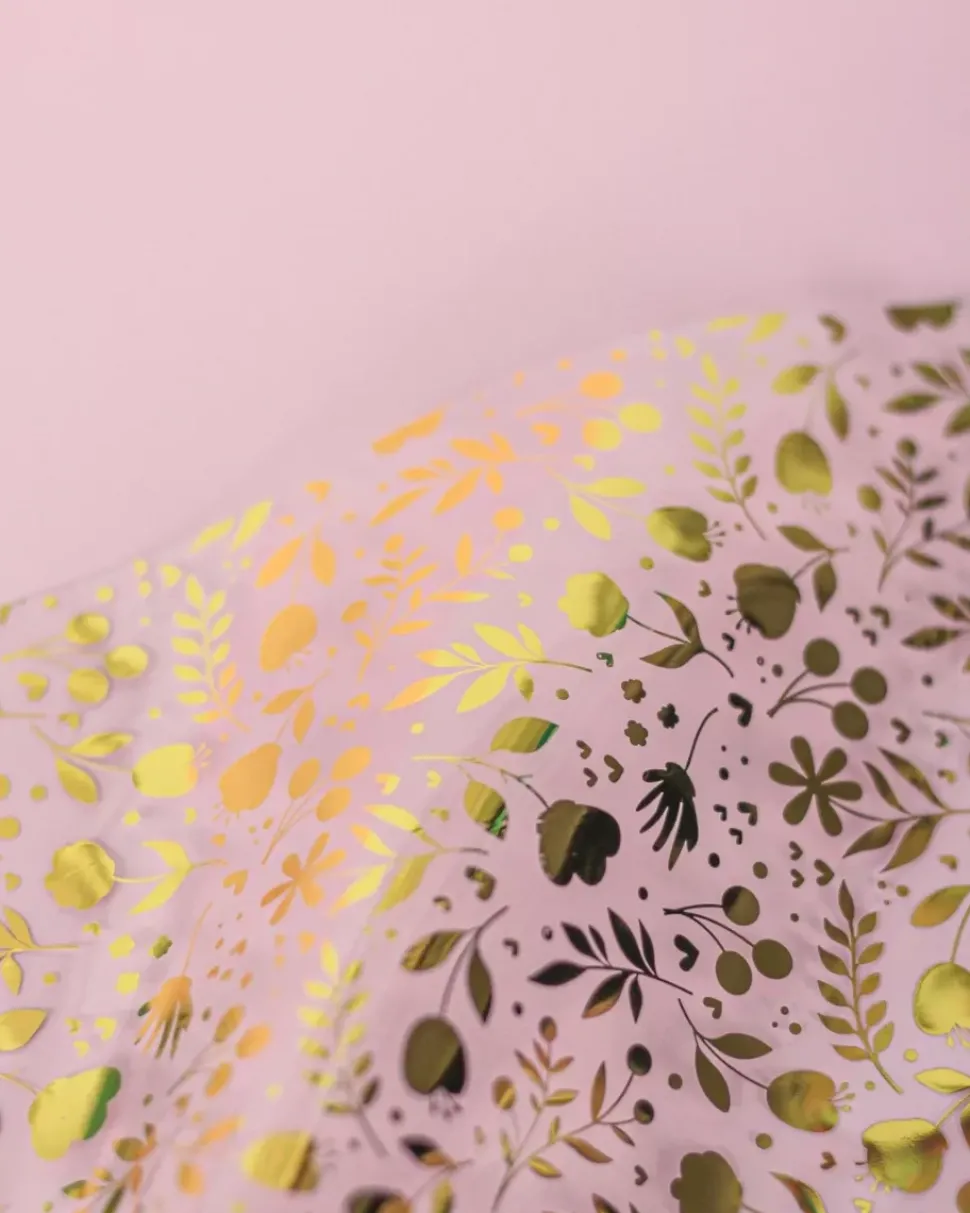 - Incluye un patrón motivos vegetales en foil oro y al reverso plata.