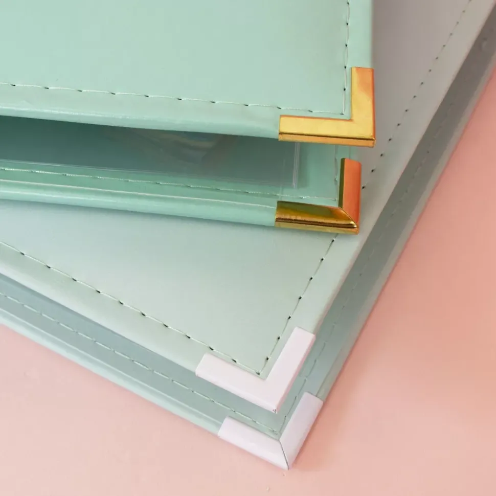Tienen unas esquineras metálicas que los protegen de todas las veces que los cojas para verlos o enseñarlos, así como un porta-etiquetas metálico en el lomo para una mejor clasificación.