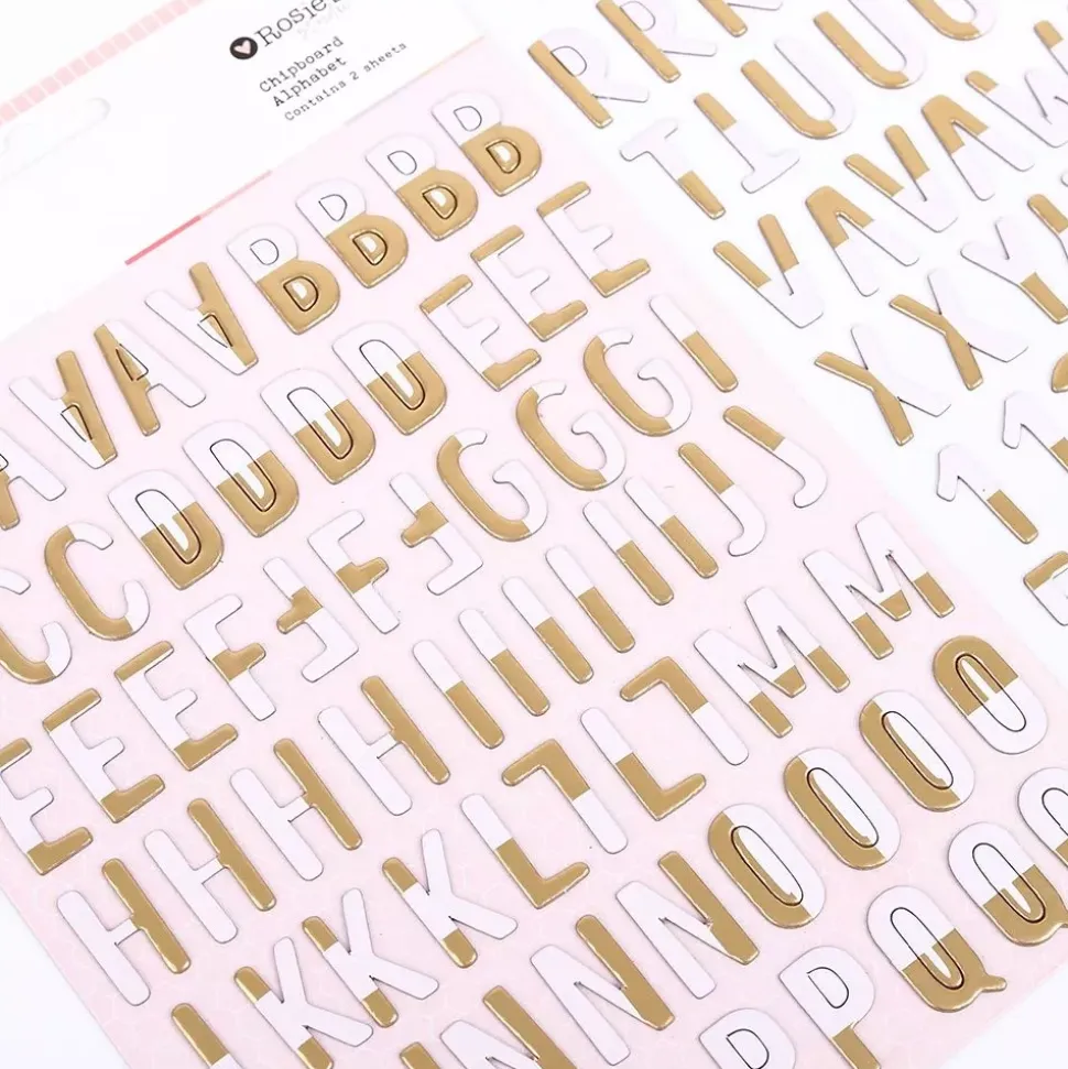 - En este set de piezas de adhesivas encontrarás las letras del abecedario en mayúsculas en color blanco con detalle en foil dorado.