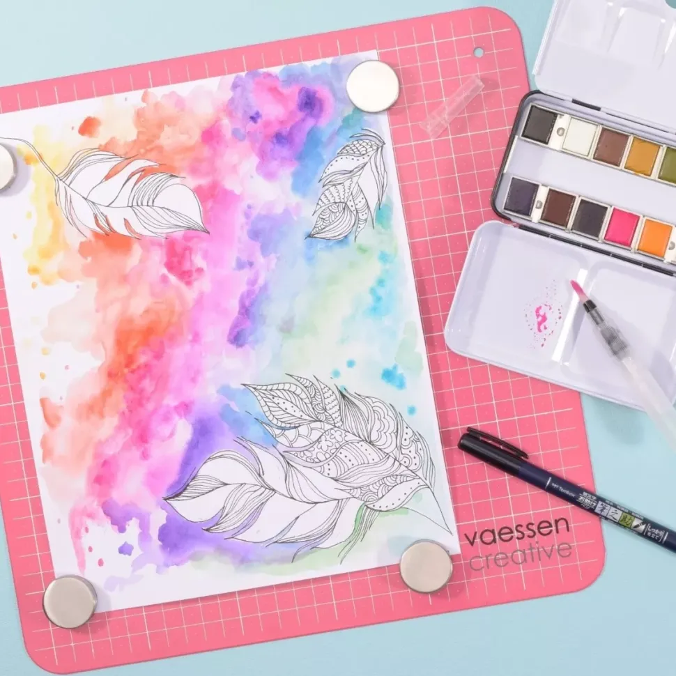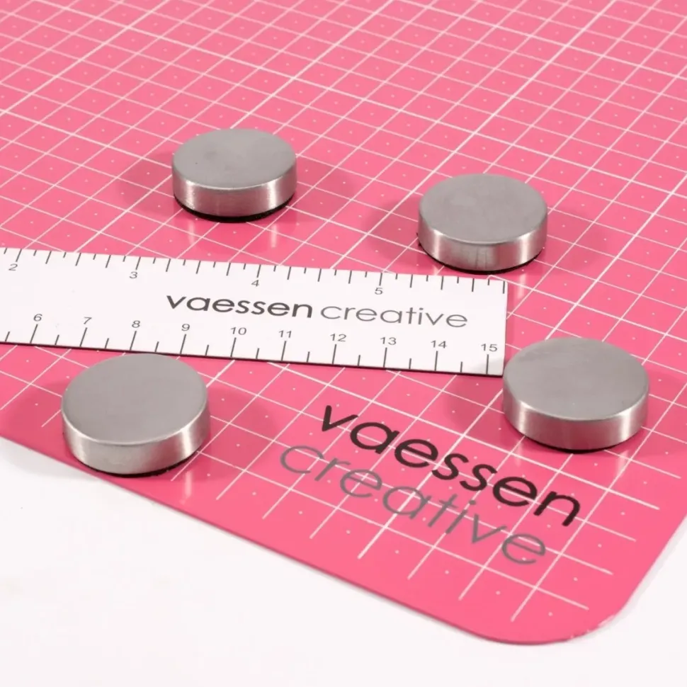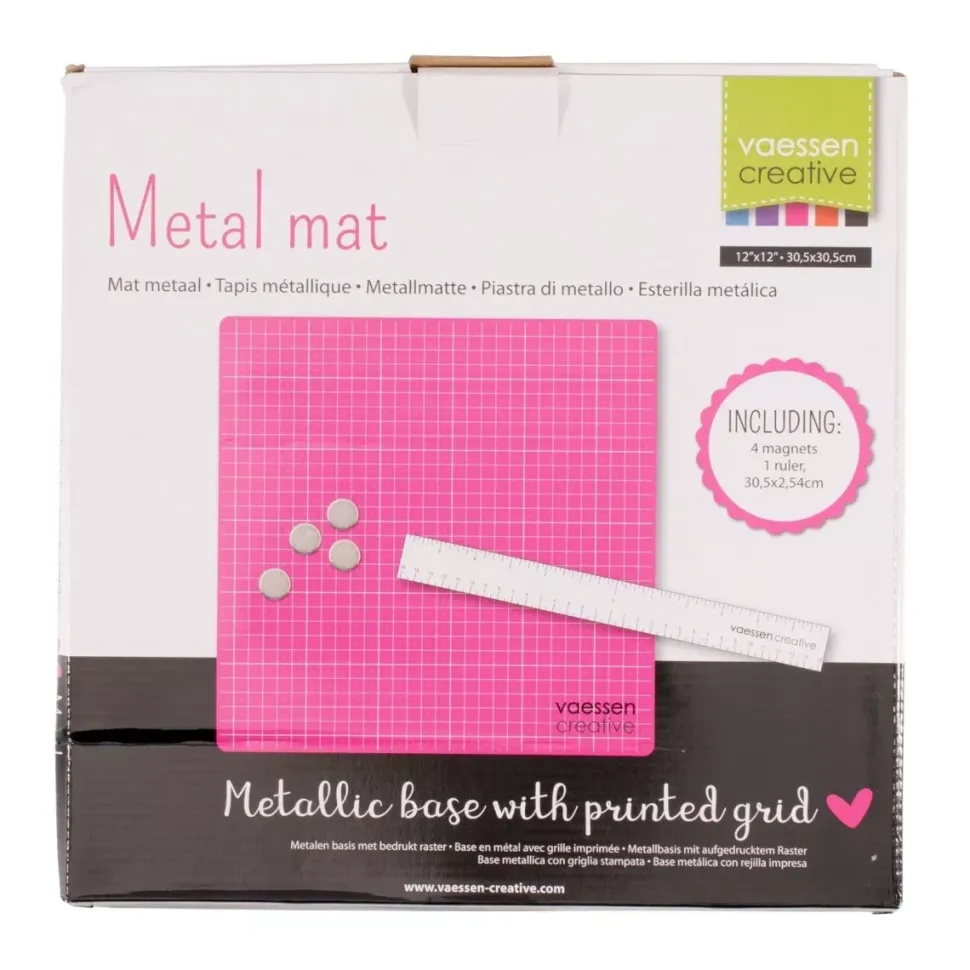 Toda la placa es magnética y tiene líneas de cuadrícula impresas. Hay 4 imanes resistentes y una regla magnética flexible con pulgadas y centímetros.