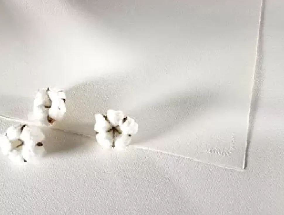 - Su composición 100% algodón, con fibras largas, confiere al papel su belleza, una blancura natural permanente, un tacto inimitable y garantiza su resistencia.