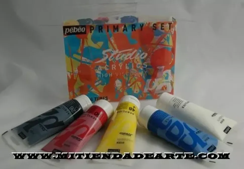 Set de plástico rígido con bandeja interior y pinturas acrílicas colores primarios, apropiadas para la pintura decorativa en madera, plástico, goma eva, papel, cartón, escayola, cerámica, etc. contiene: – 5 Tubos acrilico Studio de 100 ml. en colores primarios. ( magenta, azul cyan, amarillo primario, blanco y negro)