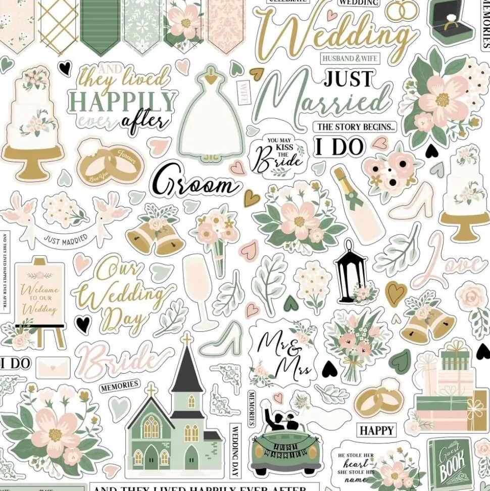 - Los motivos coordinan con el resto de la colección con ilustraciones como flores, tartas, vestidos de novia, zapatos de tacón, anillos de boda o frases en inglés y mucho más.