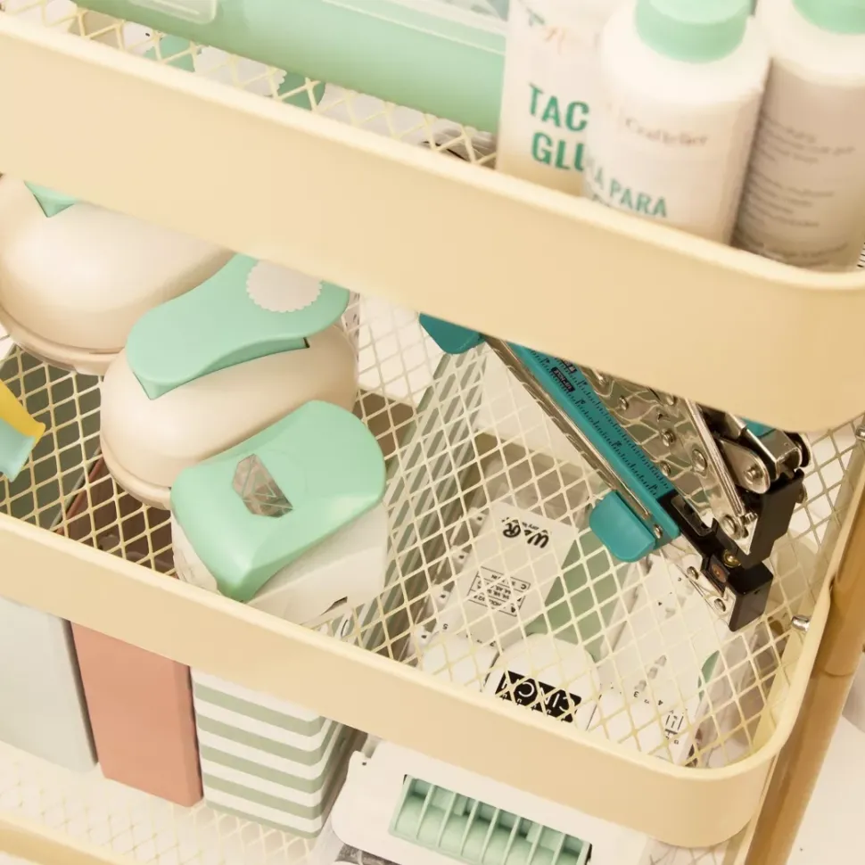 - Bonito, ligero y práctico. Este carro de organización es ideal para almacenar todo nuestro material de scrapbooking, manualidades o costura y poder tenerlo siempre a mano.