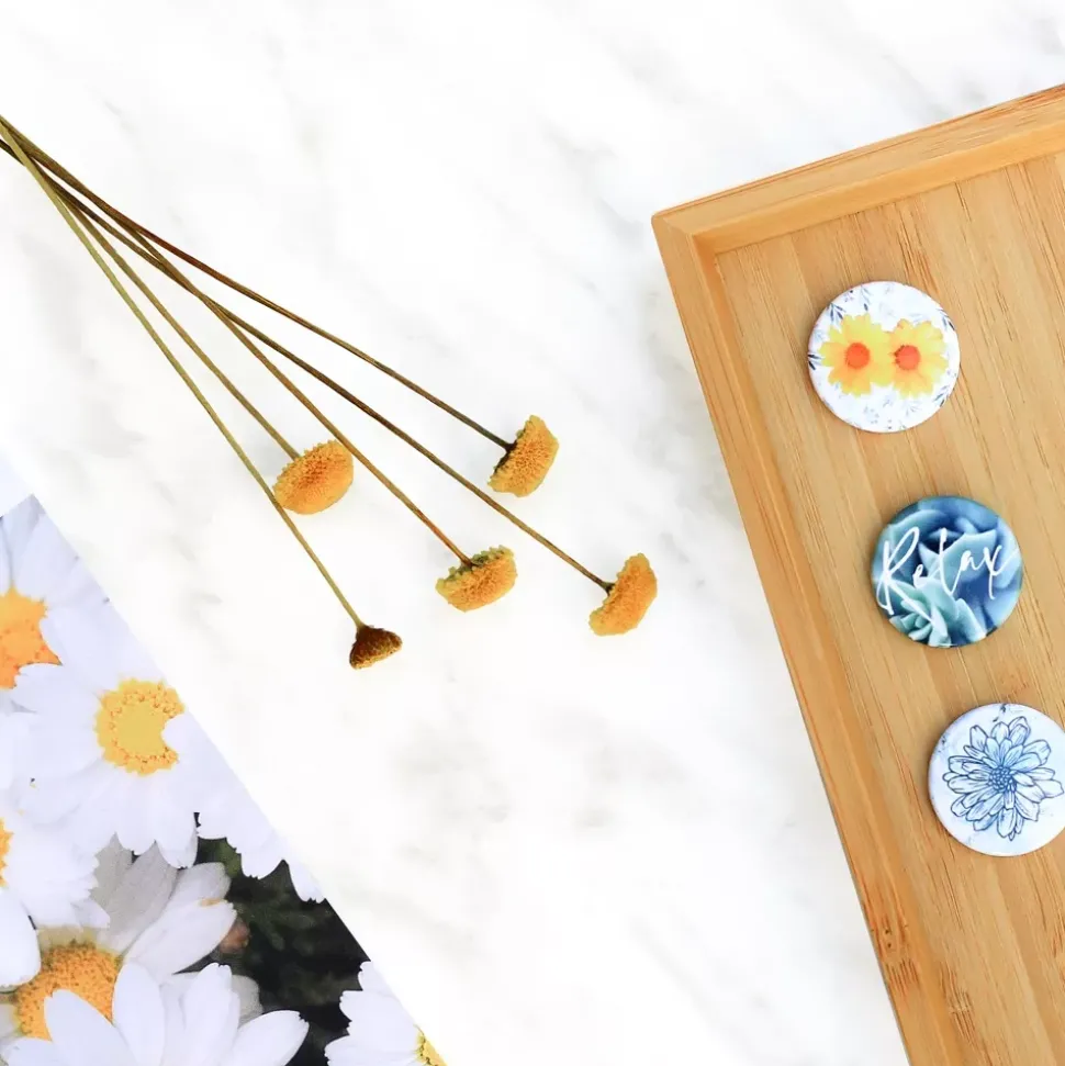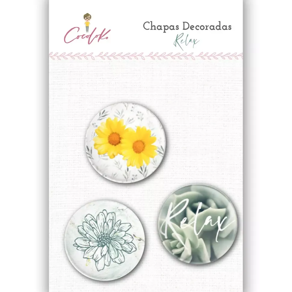 Contiene ilustraciones de suculenta, dos margaritas y la palabra relax.
