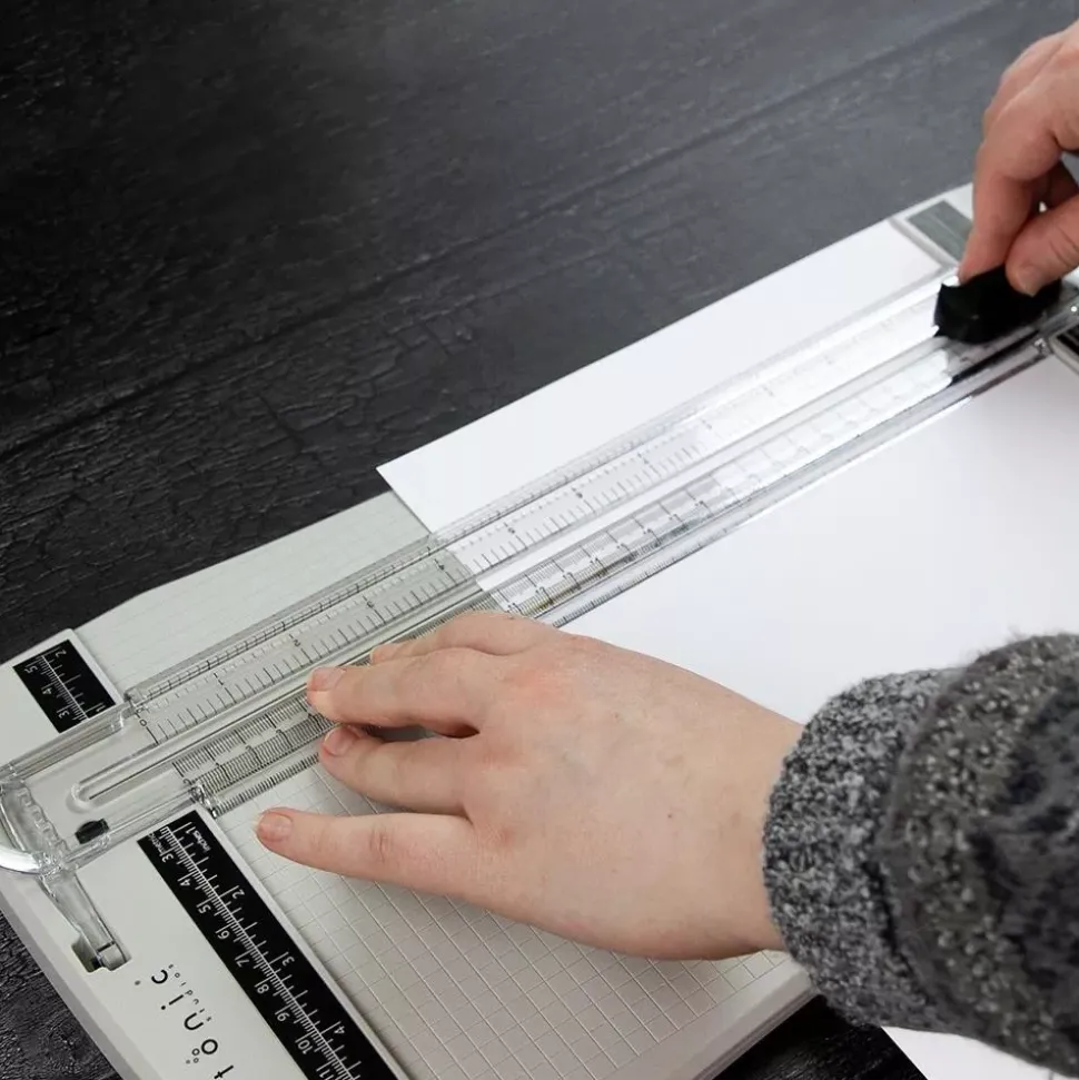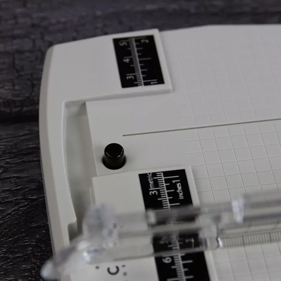 - La regla de corte se mantiene levantada para poder colocar mejor el papel, y simplemente hay que presionarla en el momento de realizar el corte o marcar el doblez.