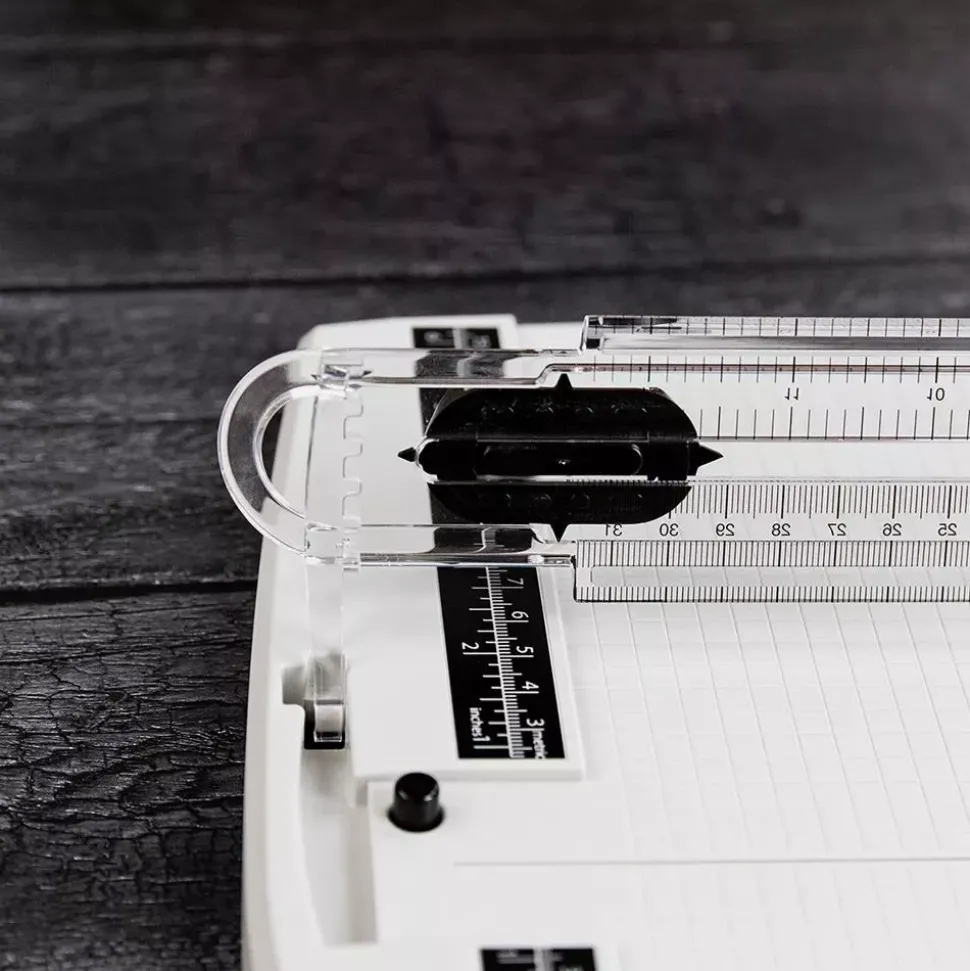 - La base señala las medias en pulgadas y en centímetros para facilitar el trabajo.