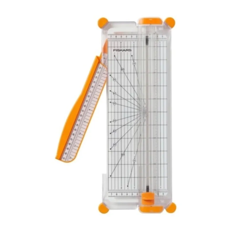 - La Cizalla para papel SureCut de base eschecha de Fiskars (A4) incluye una sólida línea de corte de acero inoxidable que permite ver donde la hoja realizará el corte con precisión.