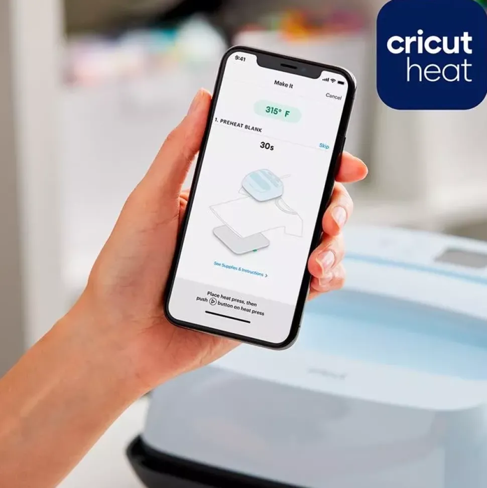 Combina la velocidad de una prensa térmica, la comodidad de una plancha y la simplicidad de la aplicación Cricut Heat, una aplicación gratuita, que te ayudará en el proceso de elaboración y prensado de tus diseños.