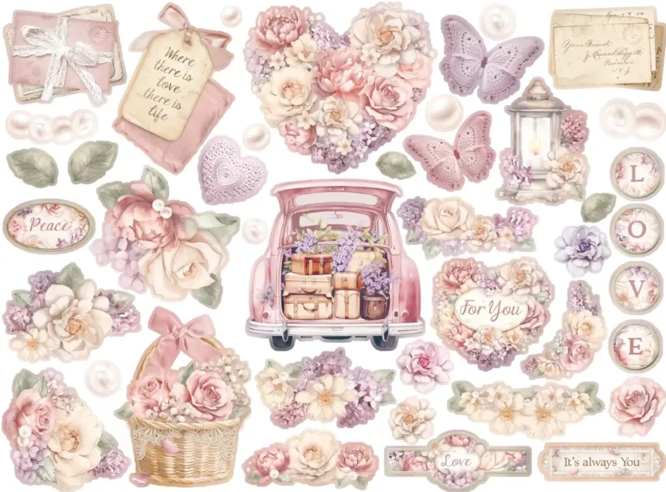 - Contiene ilustraciones de la colección Romantic Forever: motivos florales, coches vintage y frases en inglés como «For you» o «It´s always you»