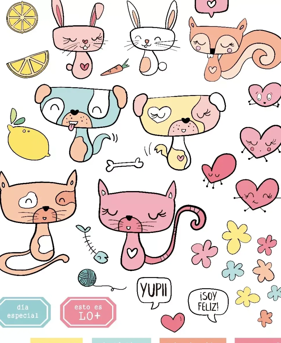 - Contiene ilustraciones de estos animales, corazones, limones flores y frases como día especial, esto es lo + viva la vida, fantástico, un gran año, etc