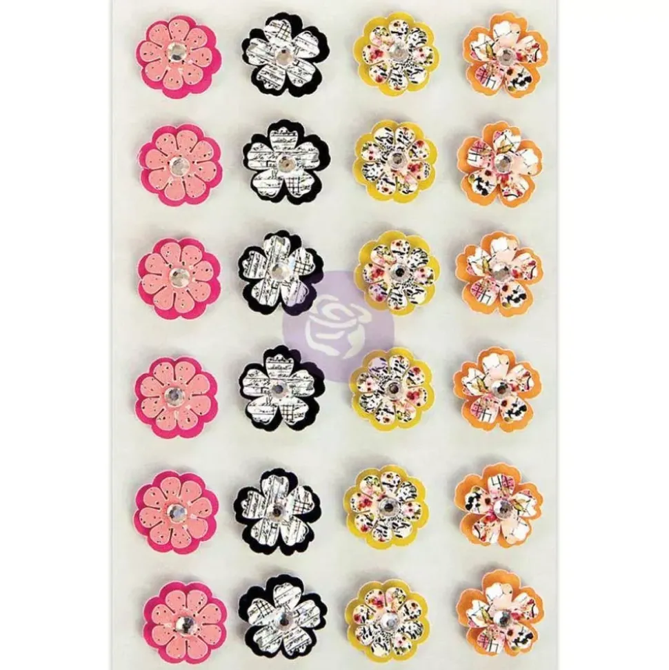 Maravillosas flores para agregar un pequeño y bonito diseño para cualquier proyecto de tarjetería, scrapbooking, mixed media, smashbook, Lay Outs, etc. Las flores son de colores rosa, fucsia, negro, amarillo y naranja con estampado formado por dos capas con una gema en el centro.