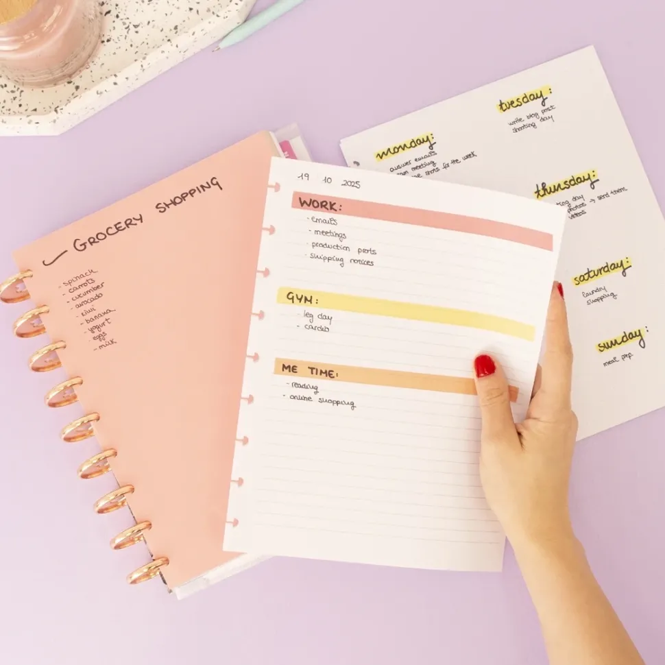 - Incluye 25 hojas pretorqueladas para planners de disco de 9 anillas.