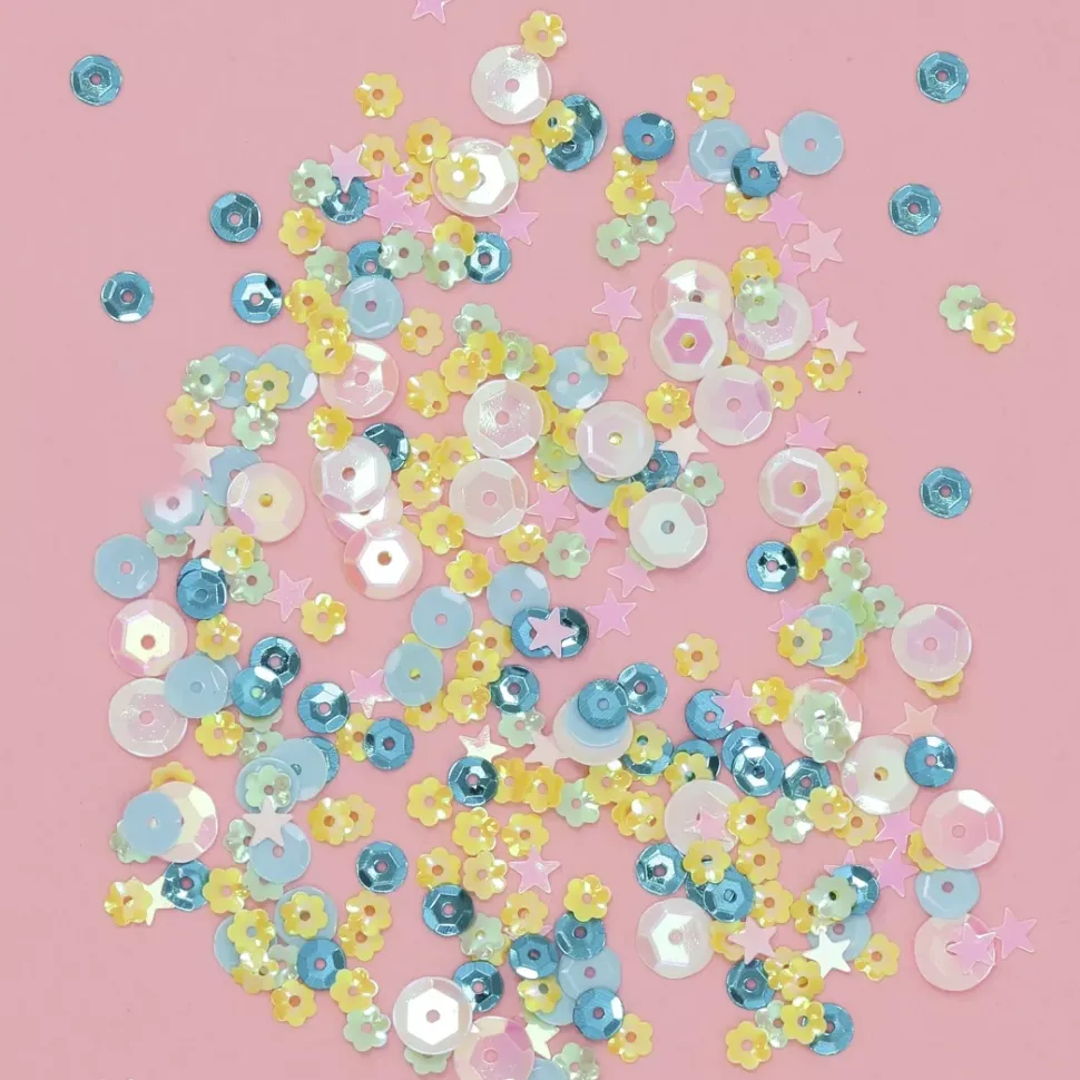 - Mix de lentejuelas de diferentes tamaños, con forma de pequeñas estrellas y flores en colores verdes, turquesas, rosas y amarillos.