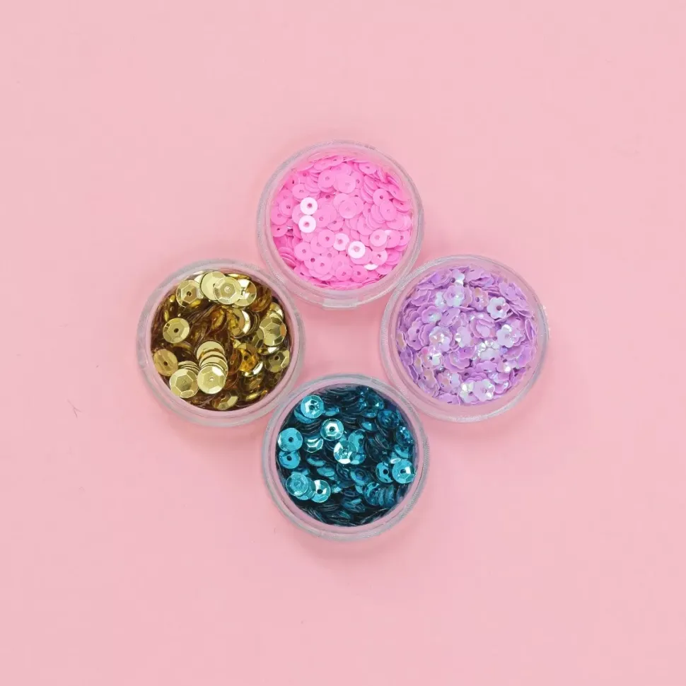 - Lentejuelas en forma de pequeñas flores de color lila.