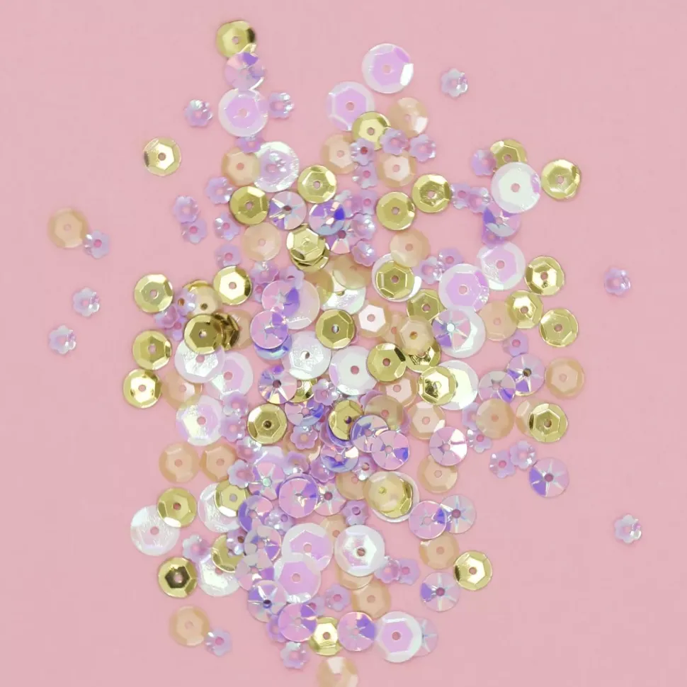 - Mix de lentejuelas en diferentes tamaños en tonos dorados y suaves lilas y lentejuelas lilas en forma de pequeñas flores.