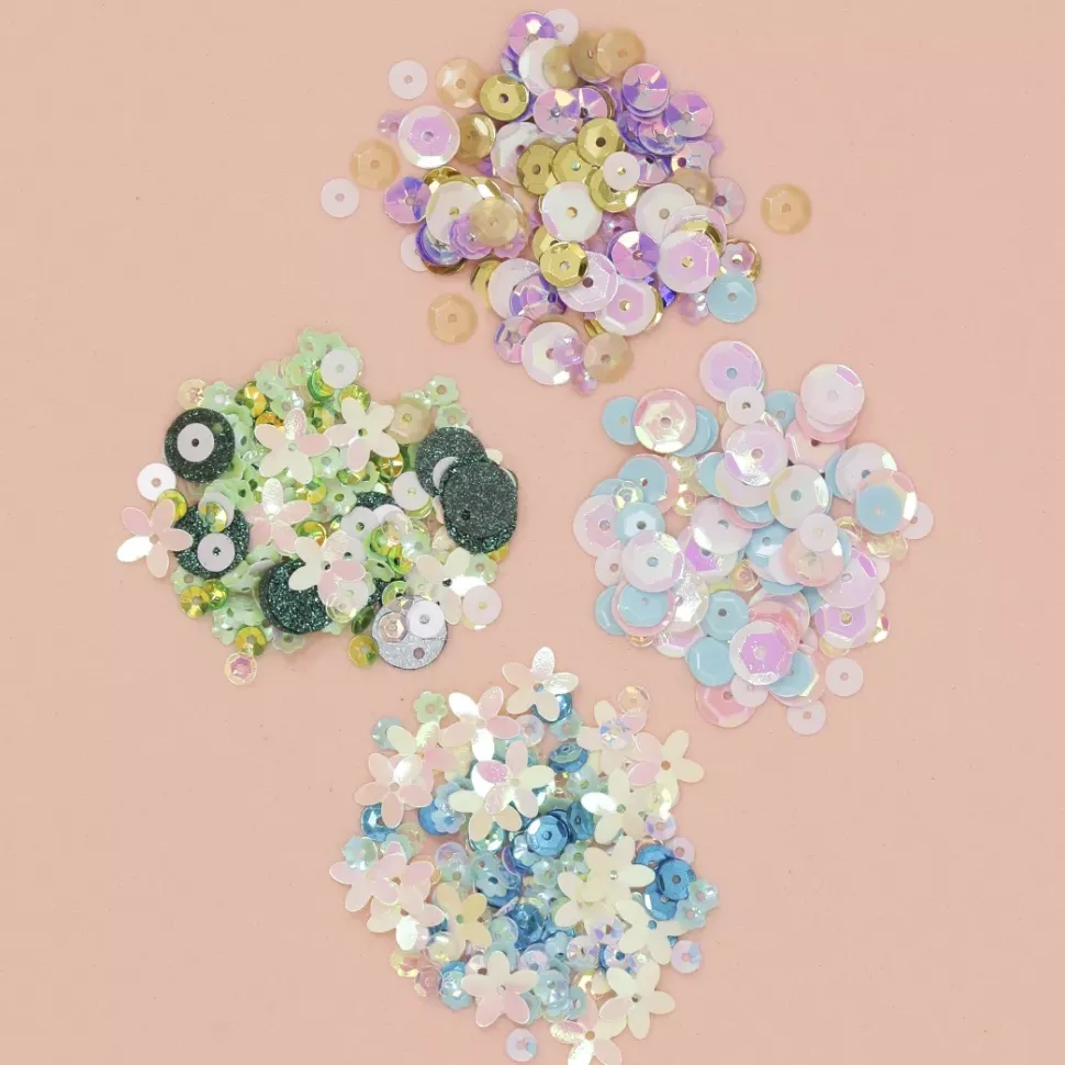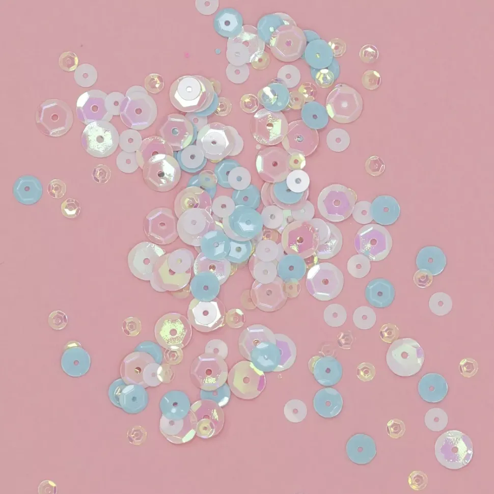 - Mix de lentejuelas de diferentes tamaños en tonos blancos, azules y rosas.