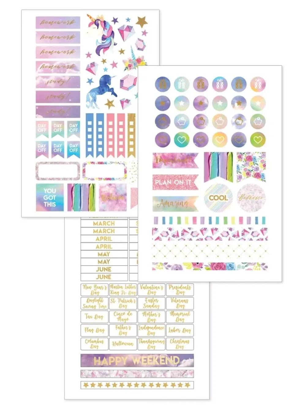- – 3 hojas de stickers con los meses, iconos de carros de compra, cámaras de fotos, globos, tartas, flores o faros. Algunos de los stickers tiene foil dorado.