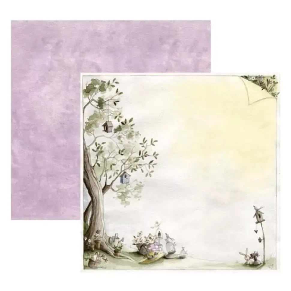 - – Papel estampado de una escena de un arbol con casitas y un picnic bajo la copa Por la cara posterior, cun fondo de aguada en color lila.