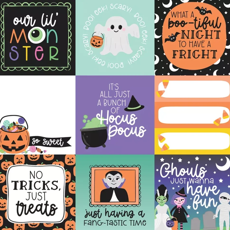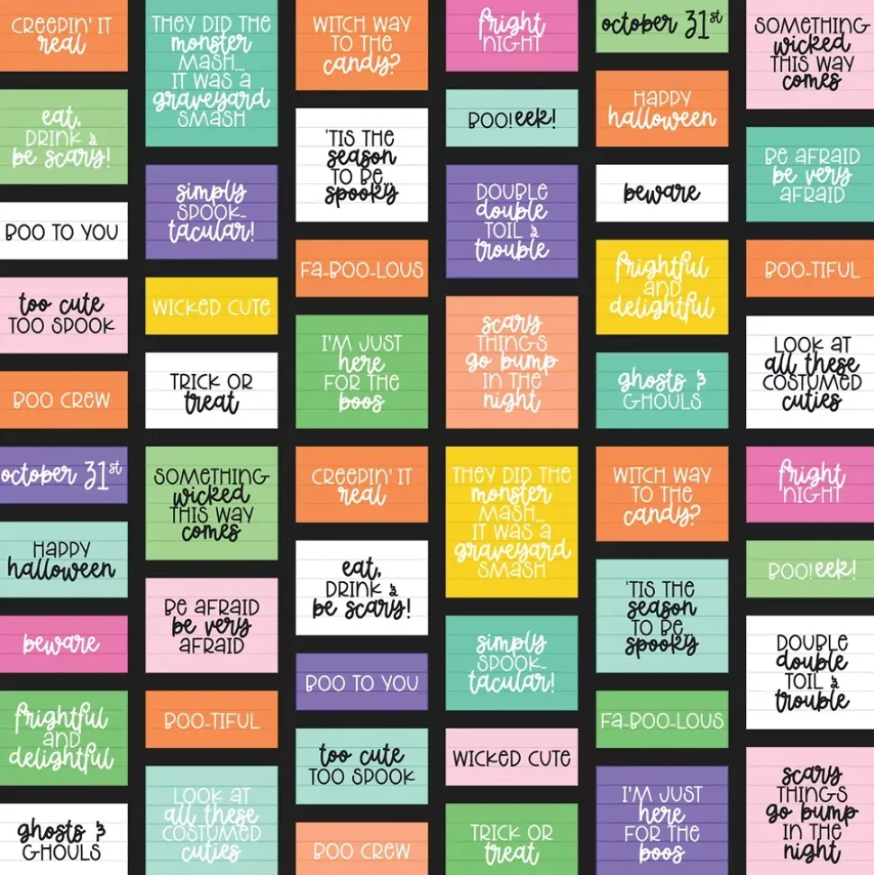 - Papel estampado con tarjetas de 4″x4″ con motivos de la colección. La parte posterior del papel cuenta un estampado de recuadros de colores que incluyen frases de Halloween sobre un fondo negro.
