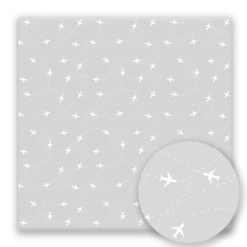 - Papel de acetato estampado con un patrón de pequeños aviones.
