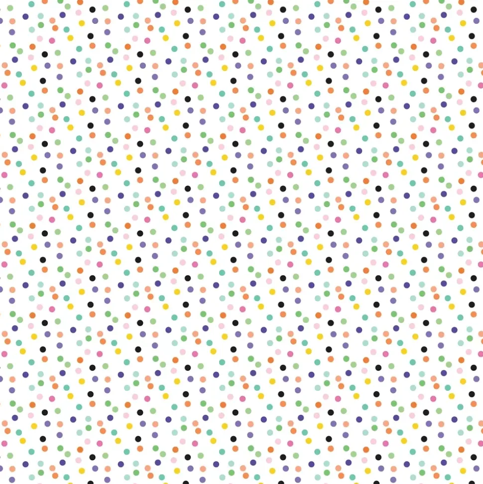 - Papel estampado con tarjetas de diferentes tamaños que incluyen motivos de la colección. La parte posterior del papel cuenta un estampado de lunares de colores sobre un fondo blanco.