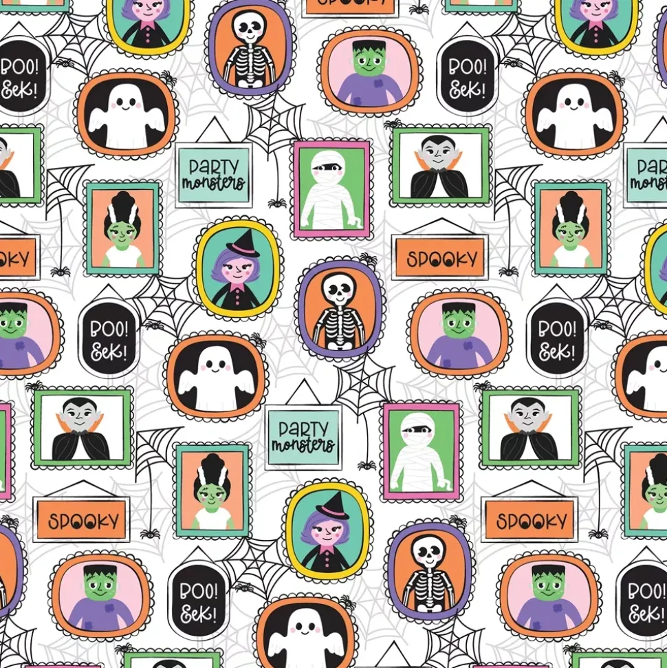 - Papel estampado con marcos de cuadros que incluyen retratos de simpáticos monstruos. La parte posterior del papel cuenta un patrón de rayas verticales en negro y naranja.