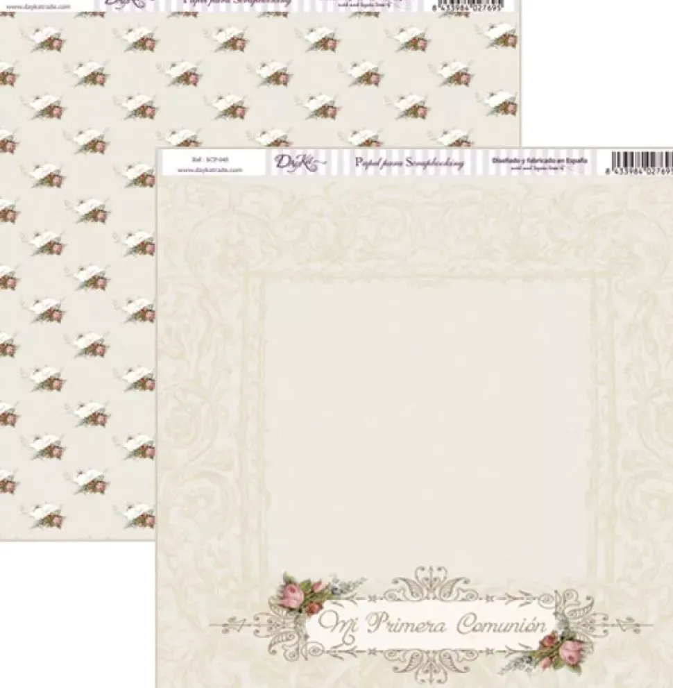 - – Papel estampado con un marco barroco cuadrado y el texto Mi Primera Comunión. Por la cara posterior, bouquets de flores repetitivos en tonos rosas sobre fondo beige.