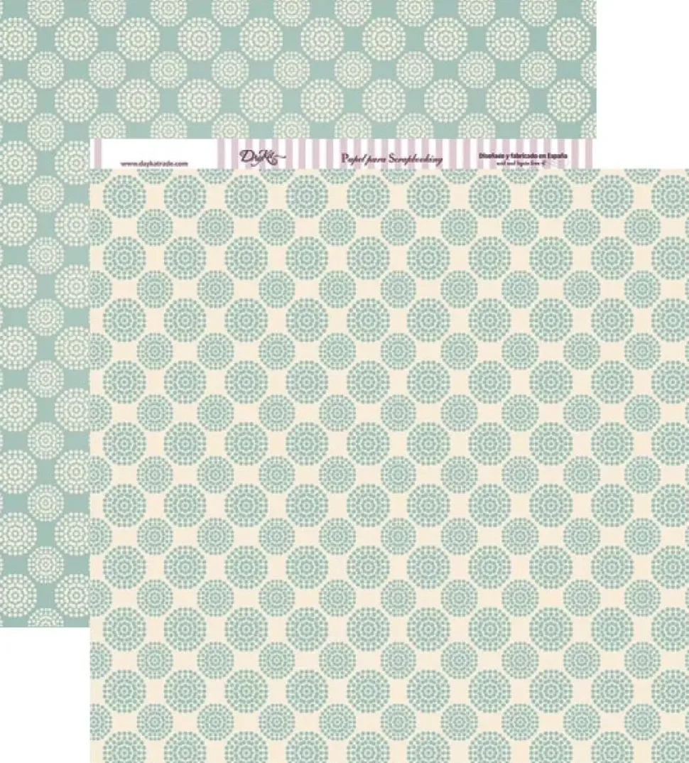 - – Papel estampado con rosetones verdes aguamarina sobre fondo beige. Por la cara posterior, los mismos rosetones en aguamarina sobre fondo verde aguamarina oscuro.