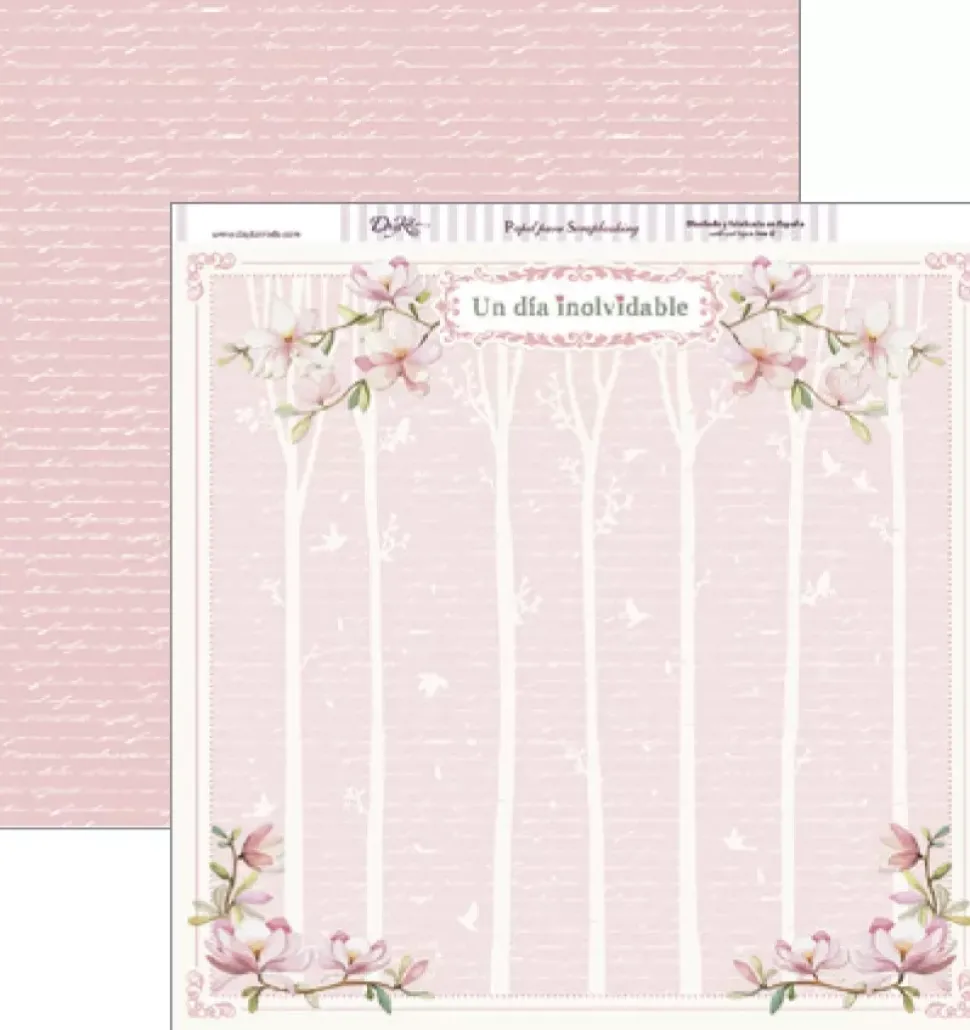 – Papel estampado de árboles con hojas cayendo sobre un fondo de caligrafía blanca sobre rosa con un marco con esquineras de flores de lamendro y un título en la parte superior Un día inolvidable. Por la cara posterior, manuscrito blanco sobre fondo rosa.
