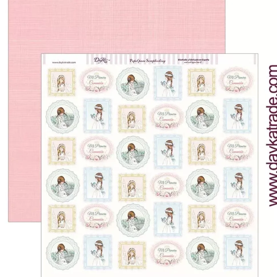 - – Papel estampadode de marcos pequeños con ilustracioones de niñas de comunión y el letreromi primera comunión. Por la cara posterior, lineas finas blancas sobre fondo rosa.