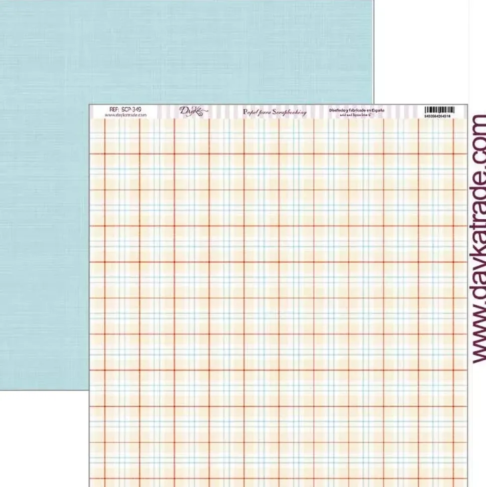 - – Papel estampado de cuadros delineados en rojo, azul hielo y blanco sobre fondo amarillo. Por la cara posterior, textura textil en color azul hielo.