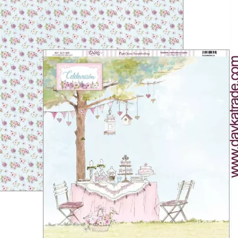 - – Papel estampado de una mesa llena de dulces y velas con dos sills bajo la sombra de un árbol con banderiens, corazones, casita de pájaros y jaula y un cartel que reza celebración. Por la cara posterior, repeticiones de pequeñas flores lilas, rosas y blancas sobre fondo blanco.