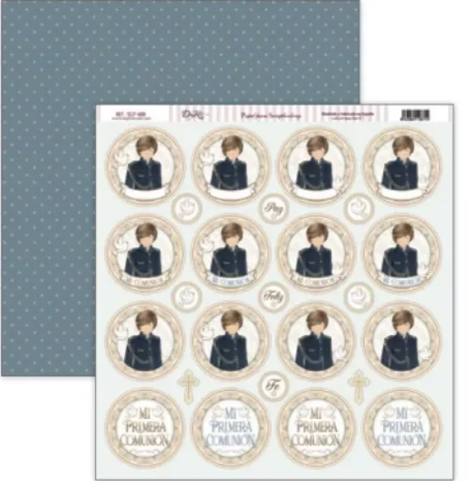 - – Papel estampado con etiquetas circulares con ilustraciones de un niño vestido de comunión con traje tipo almirante. Por la cara posterior encontramos un estampado de puntitos beige sobre un fondo azul oscuro.