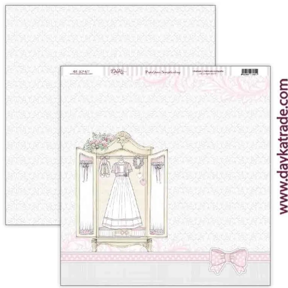 - Papel impreso a doble cara con un armario con un traje de comunión de niña por la cara delantera y brocados en tonos grises por la trasera.