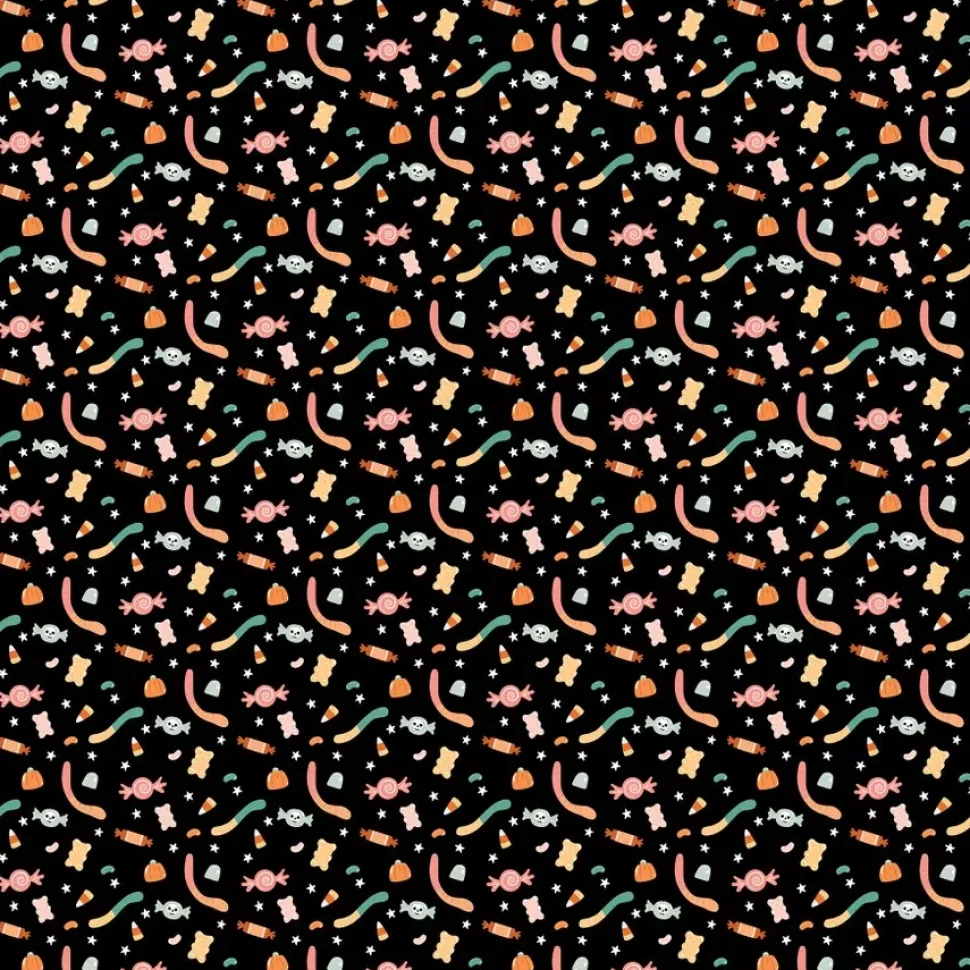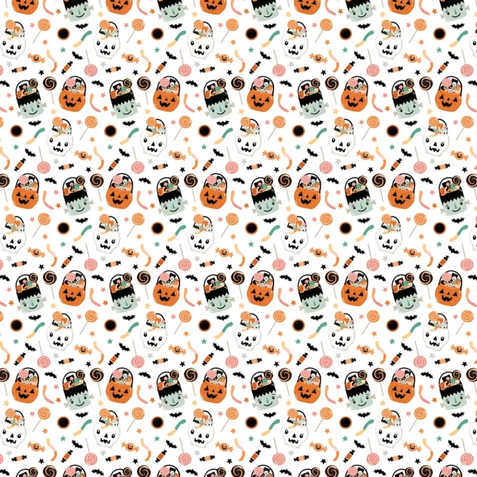 - Papel estampado con cestas de caramelos con forma de calabaza, esqueleto o Frankenstein. El reverso del papel cuenta con un estampado de caramelos sobre un fondo negro.