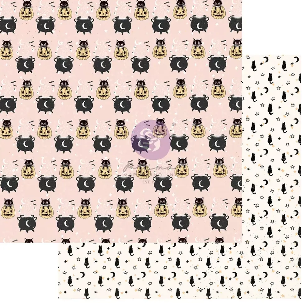 - Papel estampado con un patrón de calderos y gatitos metidos en una calabaza. Por la cara posterior, presenta un patrón de gatos negros y estrellitas.