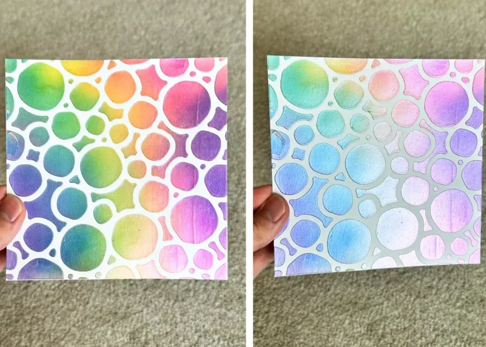 - El color es más sutil sobre cartulina blanca, pero tiene un intenso brillo cuando se aplica sobre un fondo oscuro.