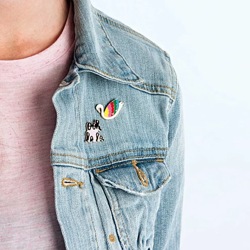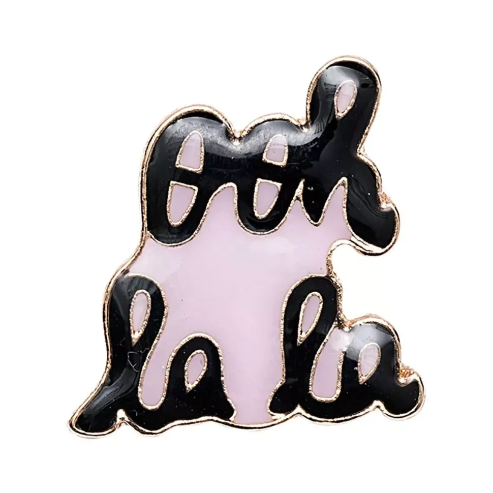 - Pequeño pin con la frase ooh la la en negro sobre fondo rosa.